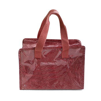 This tote is made of 70g non woven with clear PVC lamination. Easy clean exterior, top zippered closure and two webbed handles.