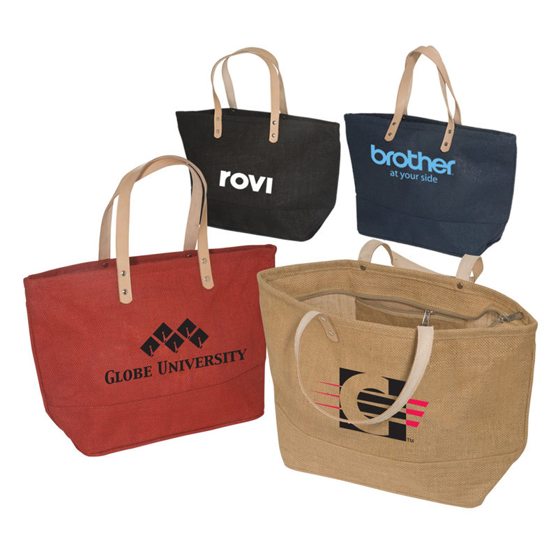 This tote is made of laminated natural jute fabric with leather handles and top zipper closure. It has small pocket with zipper inside. Whether you carry this to farmer's market or supermarket to get groceries, this durably made tote bag will surely hold up any grocery you purchased.