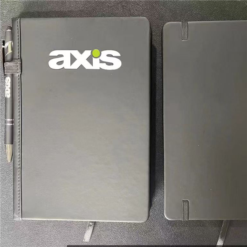 Vinyl journal with 192 ivory-lined perforated pages on the inside. Features include band strap closure, attached place holder, and outer pen band on binding. Includes matching push-action ballpoint plastic pen.